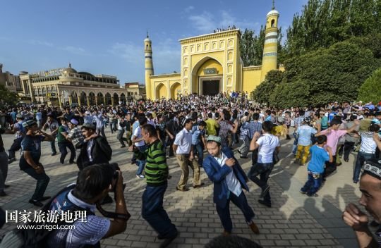 當(dāng)日,近3萬(wàn)名各族穆斯林群眾前往新疆最大清真寺——艾提尕爾清真寺做禮拜,喜迎開(kāi)齋節(jié)。