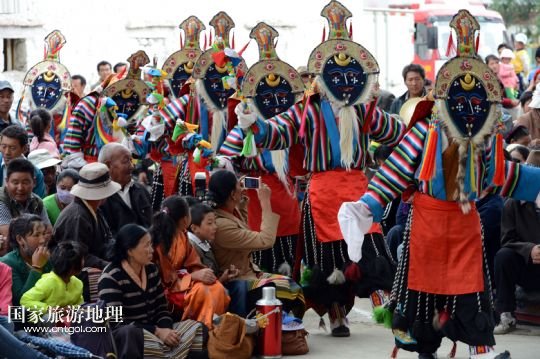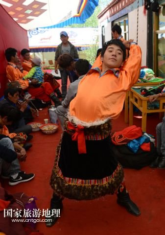 8月6日,在西藏堆龍德慶縣乃瓊鎮(zhèn)甲熱村,覺木隆藏戲團(tuán)的演員們?cè)诖謇锏难╊D節(jié)慶典上表演。