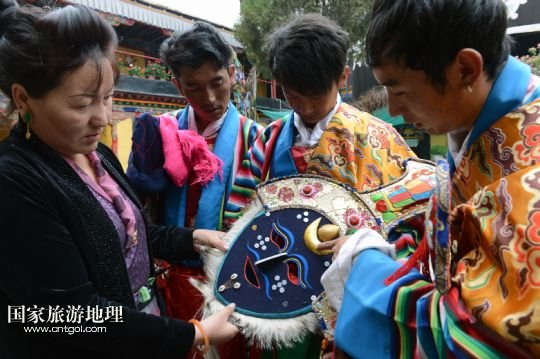 8月6日,在西藏堆龍德慶縣乃瓊鎮(zhèn)甲熱村,覺木隆藏戲團(tuán)團(tuán)長瓊達(dá)(左)和演員們準(zhǔn)備參加村里的雪頓節(jié)演出。