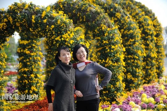 11月7日,兩位市民在菊花展上拍照留影。