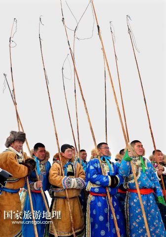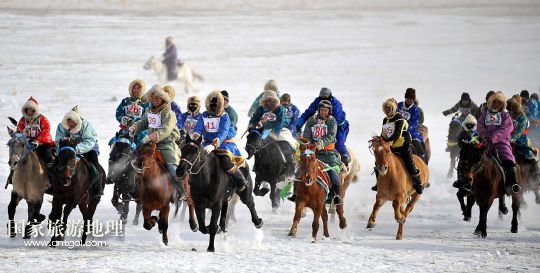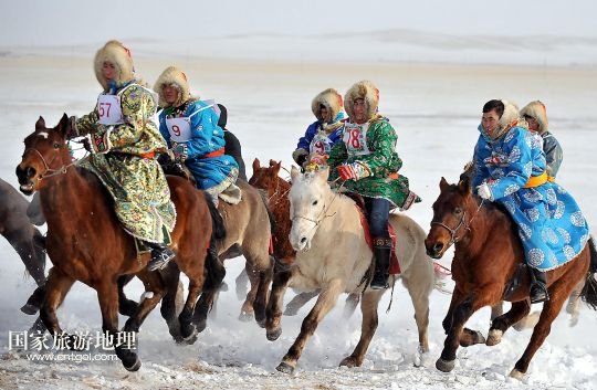 國家旅游地理 內(nèi)蒙古錫林郭勒1月5日訊 1月4日,牧民們在賽馬比賽中。當(dāng)日,2014年“銀色西烏珠穆沁”杰仁馬文化節(jié)在內(nèi)蒙古錫林郭勒盟西烏珠穆沁旗舉行。當(dāng)?shù)孛晒抛迥撩裆碇A麗的服飾,帶著自家的馬匹,冒著風(fēng)雪嚴(yán)寒,從四面八方趕到會場,參加了賽馬、套馬、乘馬拾物、蒙古馬選美等多項比賽,吸引了來自全國各地的游客、攝影愛好者以及附近的大批牧民。 /新華社記者任軍川攝