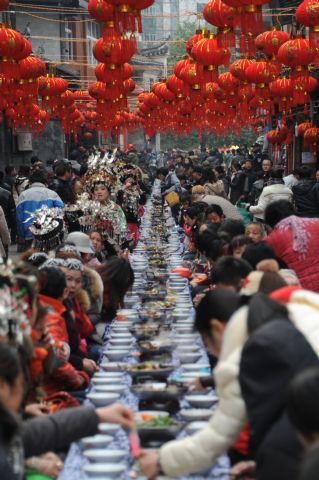 2月14日,湖南鳳凰景區(qū)擺起近百米長的苗家長龍宴,當(dāng)?shù)鼐用窈陀慰凸矐c元宵佳節(jié)。