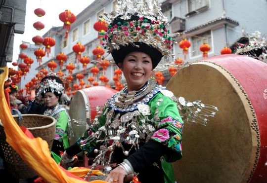 國家旅游地理 湖南湘西2月15日訊 2月14日,湖南鳳凰苗族婦女打起苗鼓。當(dāng)日是農(nóng)歷元宵節(jié),在湖南鳳凰古鎮(zhèn),當(dāng)?shù)鼐用衽c游客歡聚一堂,共同參與各種民俗文化表演活動,慶祝節(jié)日。 /新華社記者 范軍威 攝