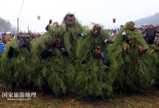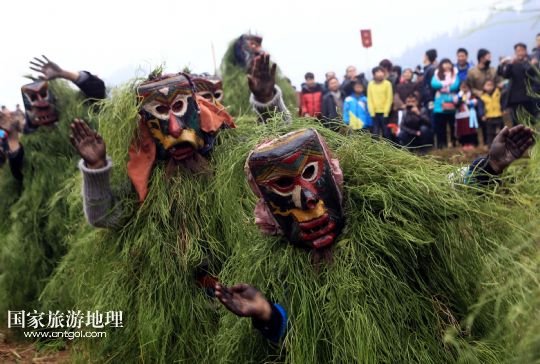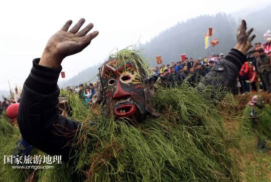 國家旅游地理 廣西柳州2月20日訊 2月16日,一名苗族青年戴著面具、披著芒草,扮成 “芒哥”跳舞。當日是農歷正月十七,地處深山的廣西柳州市融水苗族自治縣安陲鄉(xiāng)在江門苗寨舉行傳統(tǒng)的“芒哥節(jié)”。眾多苗族男性青少年戴著面具、披著芒草、扮成“芒哥”起舞,為人們驅邪避禍,送去新春的祝福。據(jù)介紹,演“芒哥”是當?shù)孛缂胰霜毦咛厣男麓簜鹘y(tǒng)活動之一。 /新華社發(fā)(龍濤 攝)