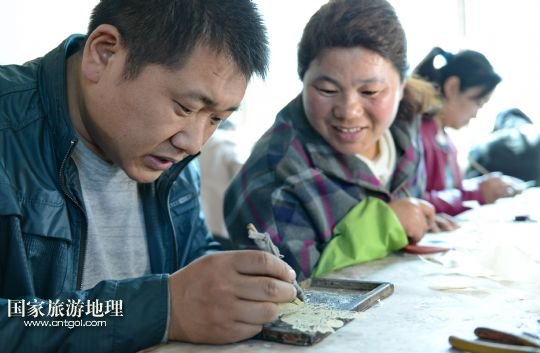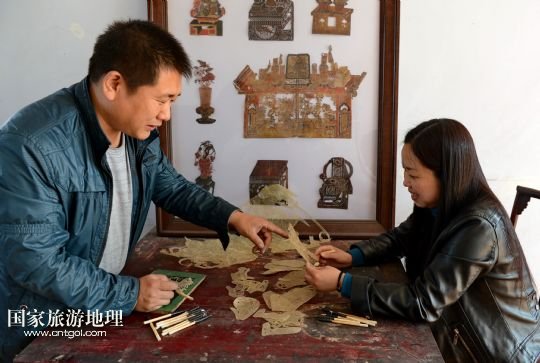 國家旅游地理 河北唐山4月2日訊 郭寶在檢查一件皮影藝術品的雕刻質量(3月30日攝)。河北省遷安市趙店子鎮(zhèn)馬古寺村村民郭寶自幼喜歡皮影雕刻,師承當地雕刻藝人王珍老先生,他雕刻的影人造型古樸、工藝精細,深受皮影收藏愛好者的歡迎。2003年,郭寶成立了“郭寶皮影傳承工作室”,并從村里招來20多位喜歡皮影藝術的農民專門從事皮影雕刻。經過幾年的發(fā)展,如今郭寶皮影工作室開發(fā)設計皮影工藝品3000余種,在傳承保護唐山皮影的同時還獲得了豐厚的收入。 /新華社記者楊世堯攝