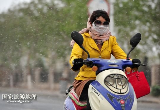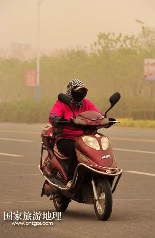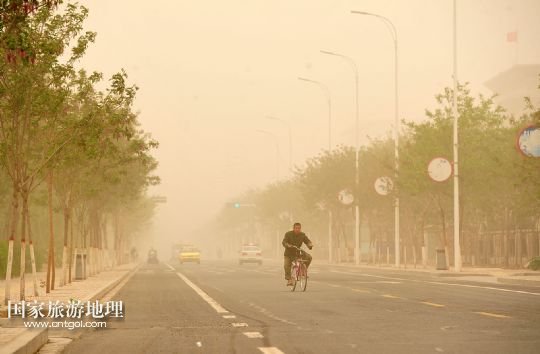 國家旅游地理 寧夏中衛(wèi)4月24日訊 4月24日,在寧夏回族自治區(qū)中衛(wèi)市,一位市民在沙塵天氣中騎行。當日,寧夏回族自治區(qū)中北部地區(qū)遭遇強沙塵天氣,寧夏氣象臺于當日7時40分發(fā)布沙塵暴黃色預警信號:預計未來12小時內(nèi)全區(qū)大部有5-6級偏北風,陣風7-8級,伴有揚沙或浮塵天氣,銀川、石嘴山、吳忠、中衛(wèi)四市的部分地區(qū)可能出現(xiàn)能見度小于1000米的沙塵暴天氣。 /新華社記者 彭昭之 攝