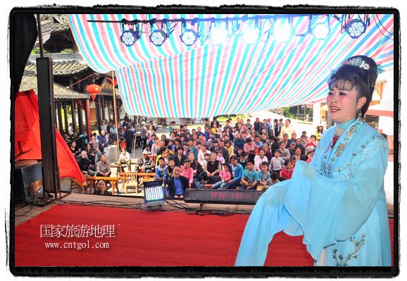 江西省婺源縣賦春鎮(zhèn)源頭村景區(qū)邀請了安徽黃梅戲劇團在村門口為村民表演輪翻上演黃梅戲】