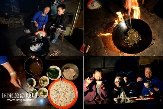 5月14日晚飯過后,高友村民在家里制作、品嘗當?shù)貍鹘y(tǒng)美食糯米韭菜油茶(拼版照片)。