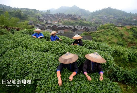 5月14日,高友村村民在寨子后面的茶園采茶。