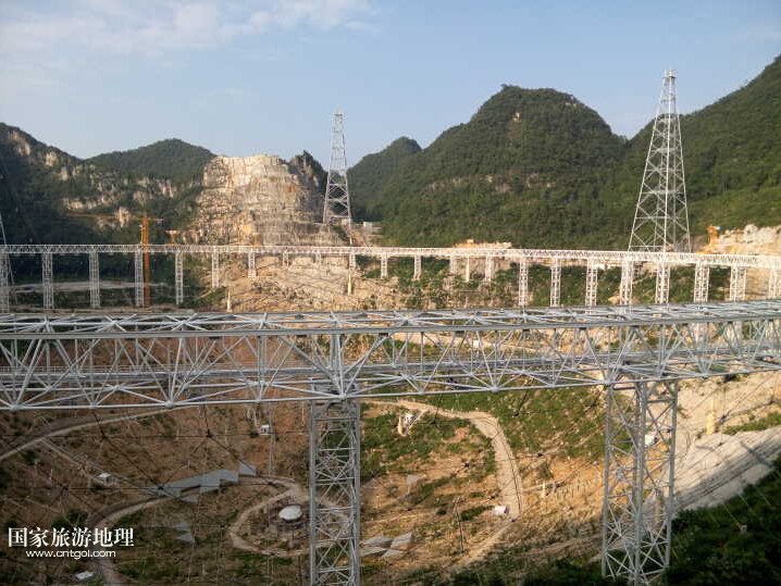 這是黔南平塘縣正在建設的大射電望遠鏡,也稱 FAST,預計將于明年九月建成。FAST具有中國獨立自主知識產(chǎn)權,是世界上正在建造及計劃中的口徑最大、最具威力的單天線射電望遠鏡,其設計綜合體現(xiàn)了我國高技術創(chuàng)新能力。500米口徑球面射電望遠鏡是利用貴州喀斯特地區(qū)的洼坑作為望遠鏡臺址,建造世界第一大單口徑射電望遠鏡,其擁有30個標準足球場大的接收面積。FAST作為世界最大的單口徑望遠鏡,將在未來20至30年保持世界一流地位。