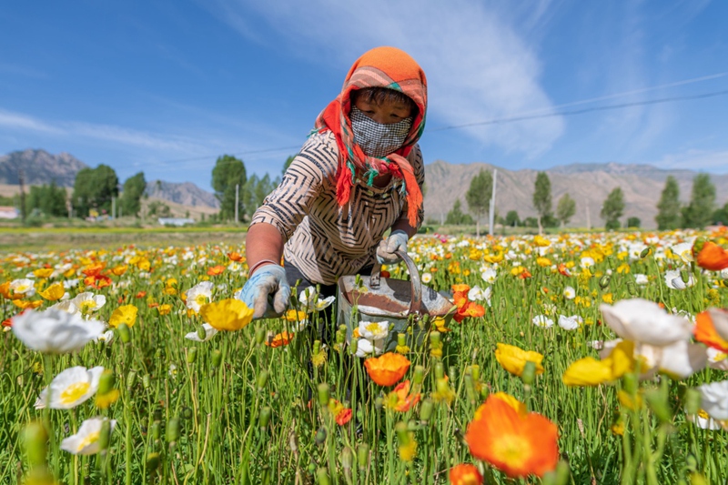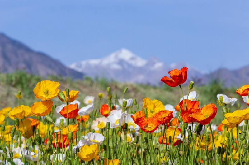 地處祁連山北麓高海拔山區(qū)的甘肅省高臺(tái)縣新壩鎮(zhèn)紅沙河村種植的虞美人繽紛綻放